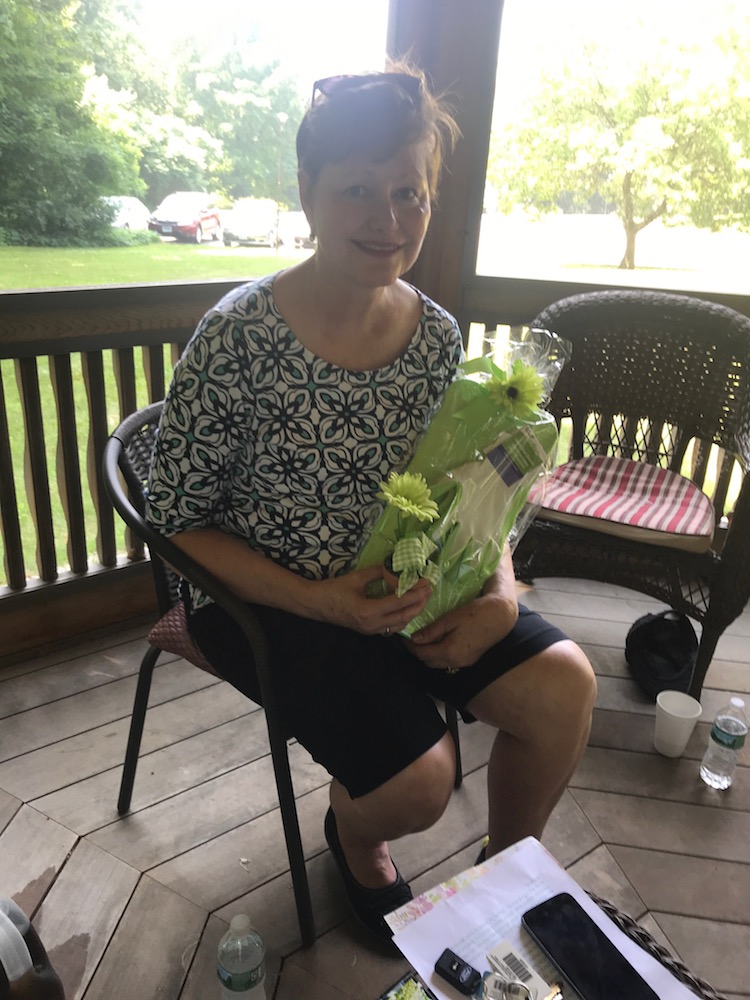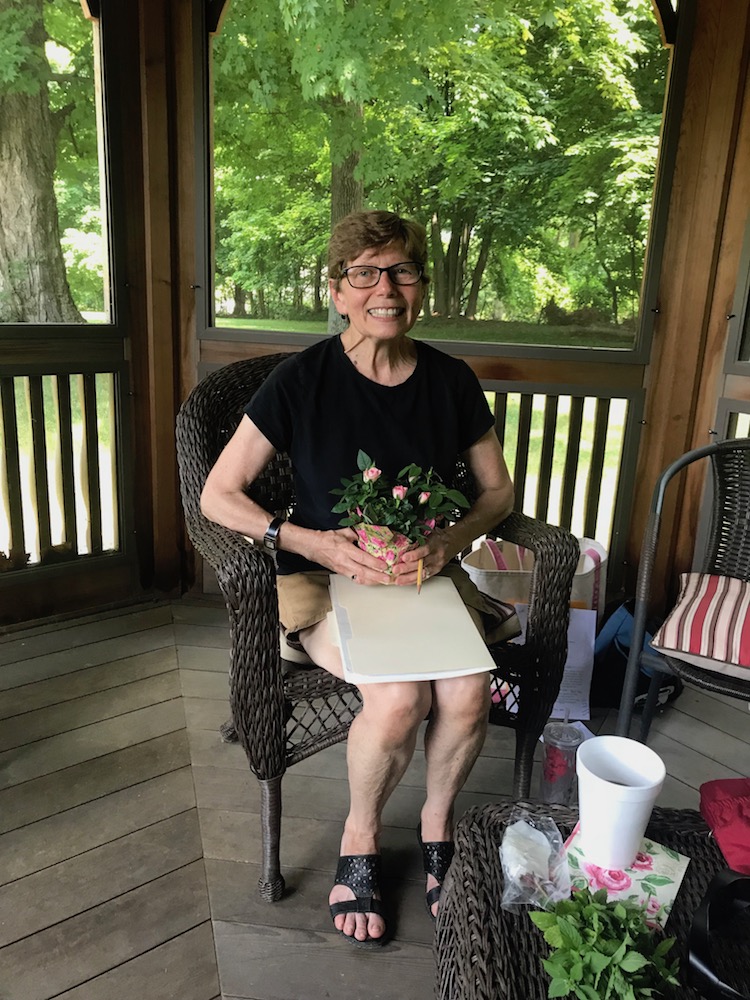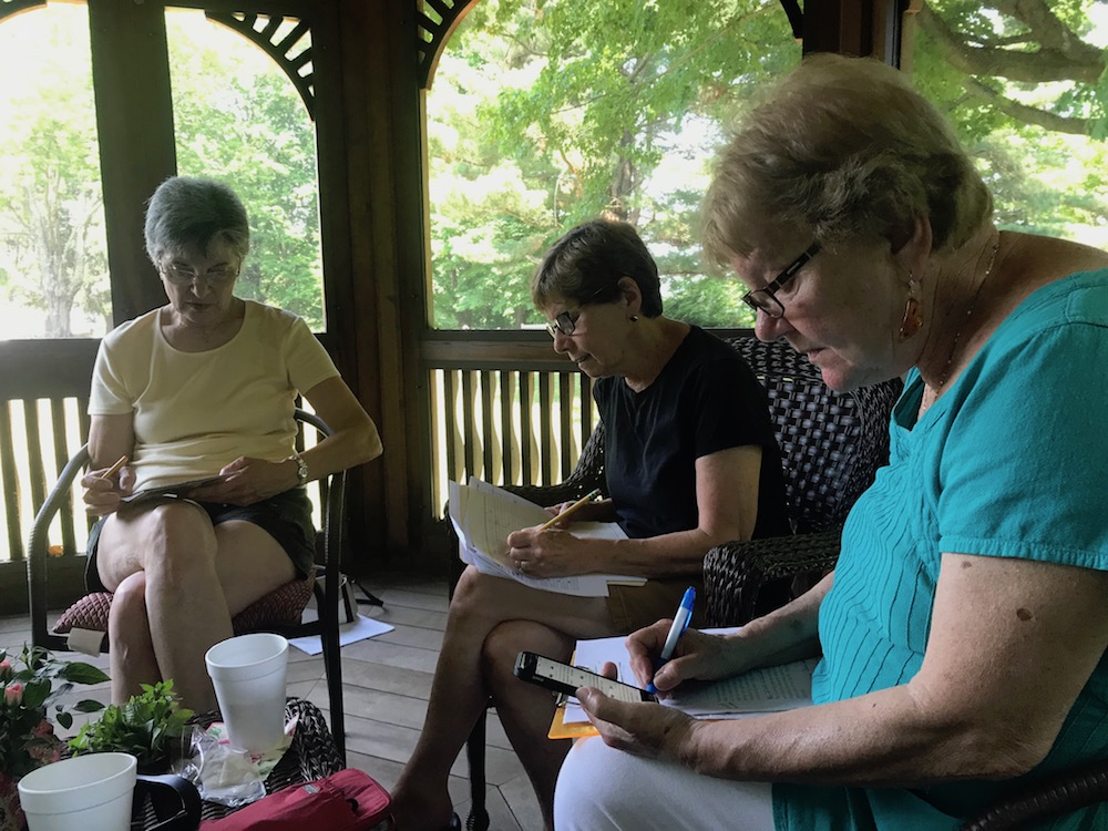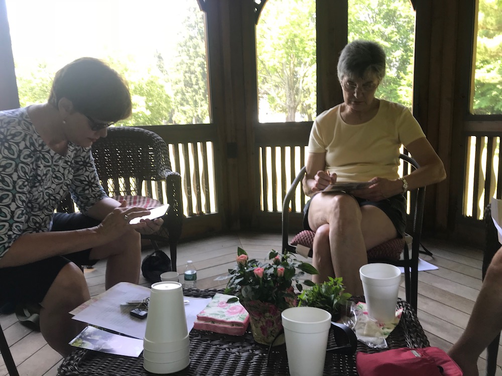 OLC ‘s Green Thumb Gardeners enjoyed Ice Tea and Lemonade as we recently held our first summer get-together.  In spite of the heat, there was a lovely breeze as we sat in the gazebo and planned our summer schedule for teams to meet and tend to our gardens.  We also celebrated Bernadette’s birthday!